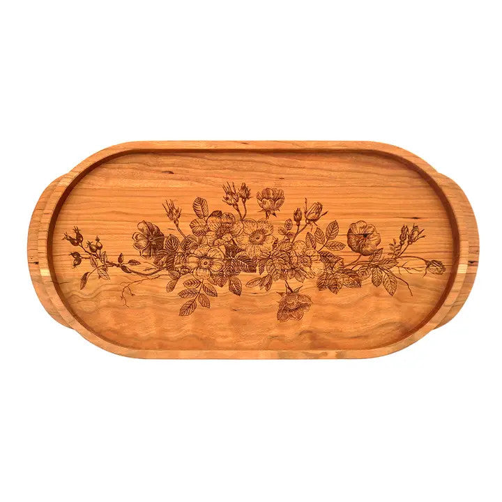 This beautiful serving tray with engraved wild roses has a rimmed edge and integrated handles for a sleek and easy serving experience! The cherry tray is made in Vermont and measures 21.5" x 10" x 1.3"